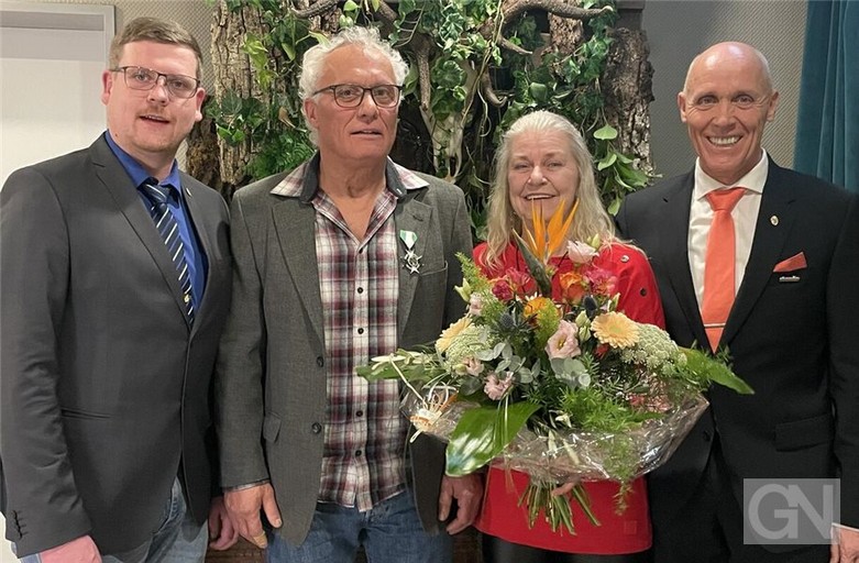 Burghard Klett (links) und Anne Corbach (rechts) vom Vorstandsteam des BSV Schüttorf überreichten Jürgen Verwold (Zweiter von rechts) den BSV-Orden für besondere Verdienste. Gese Verwold (Zweite von links) freute sich indes über einen üppigen Blumenstrauß. Foto: BSV Schüttorf